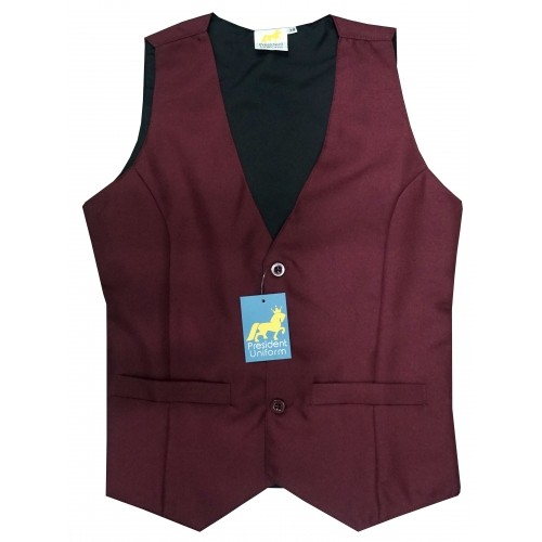 Baju kemeja biru berlengan panjang dan berkancing berseluar panjang warna biru gelap bersongkok hitam memakai vest warna biru gelap diluar berkasut kanvas hitam.