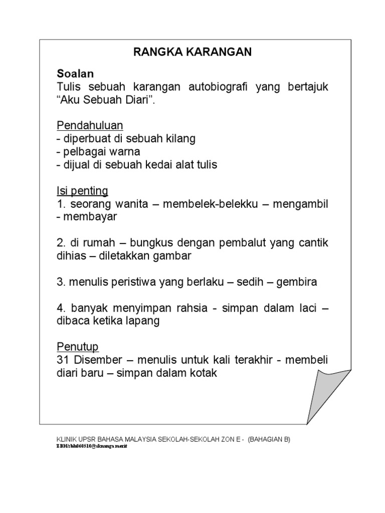 6 Gunakan bahasa yang mudah padat dan tepat. Karangan autobiografi merupakan antara jenis karangan yang sangat popular di sekolah terutamanya semasa sekolah rendah tahun 123456Karangan jenis ini hanya kerap dijumpai semasa sekolah rendah dan jarang diberikan semasa sekolah menengah. Bahasa Melayu BM Gradelevel.